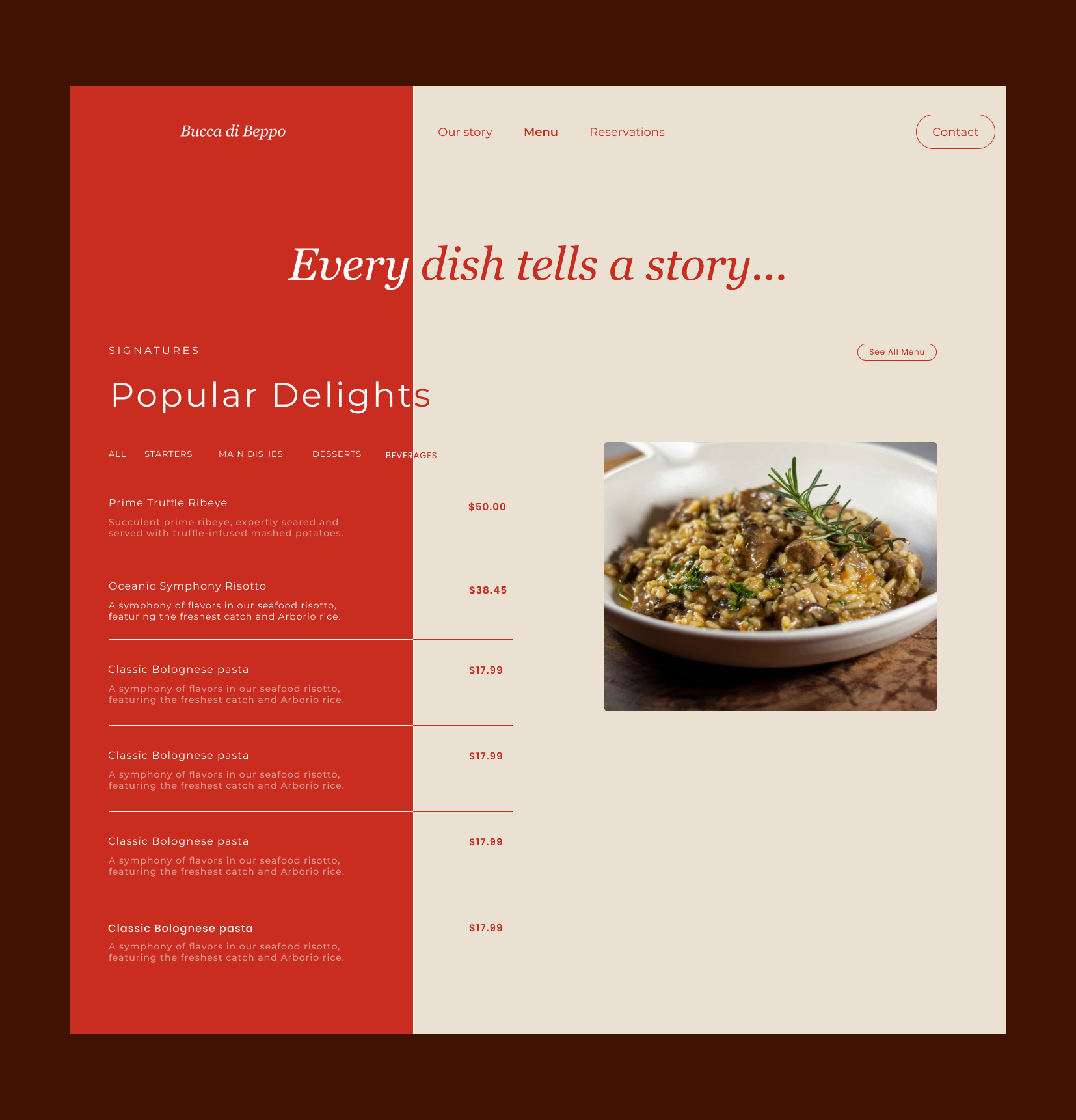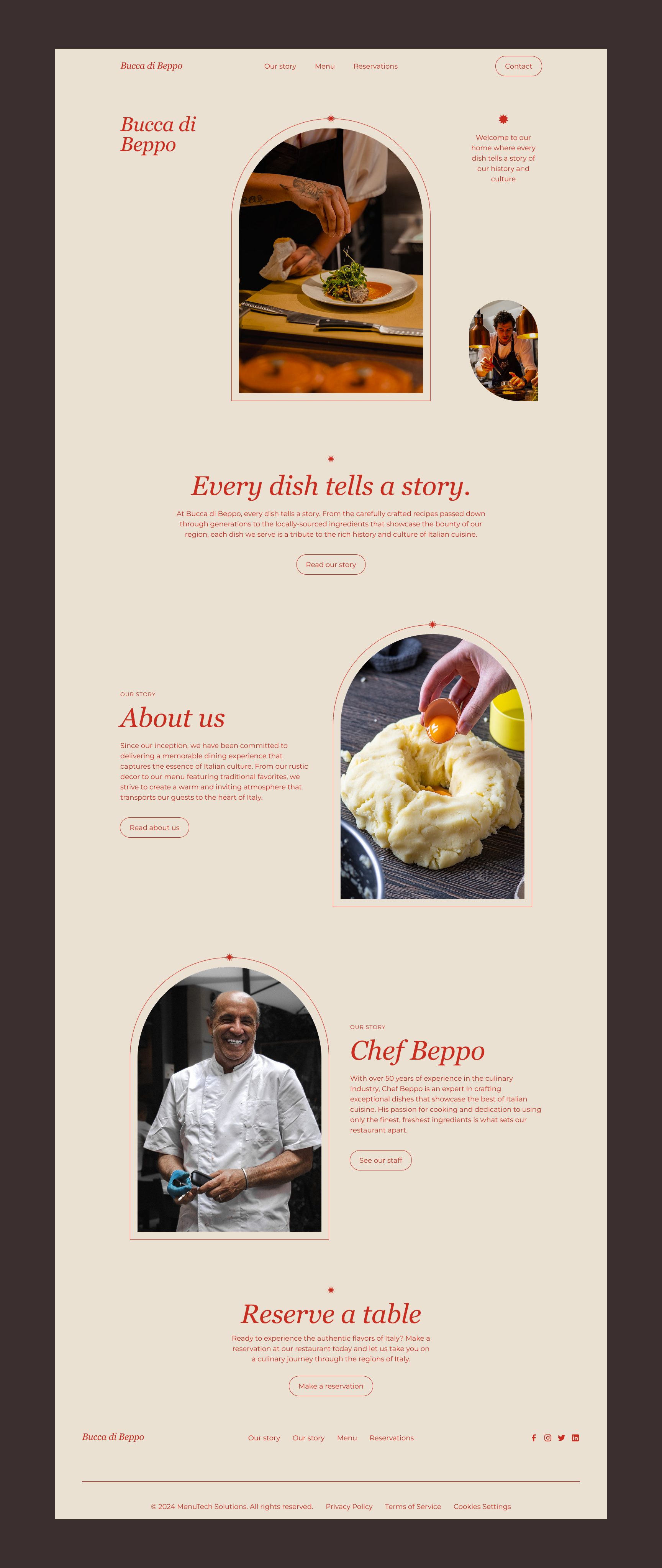 We embraced warm, earthy tones and elegant typography to evoke the ambiance of a classic Italian eatery. The use of arched frames in imagery mirrors traditional Italian architecture, adding depth and character to the design.